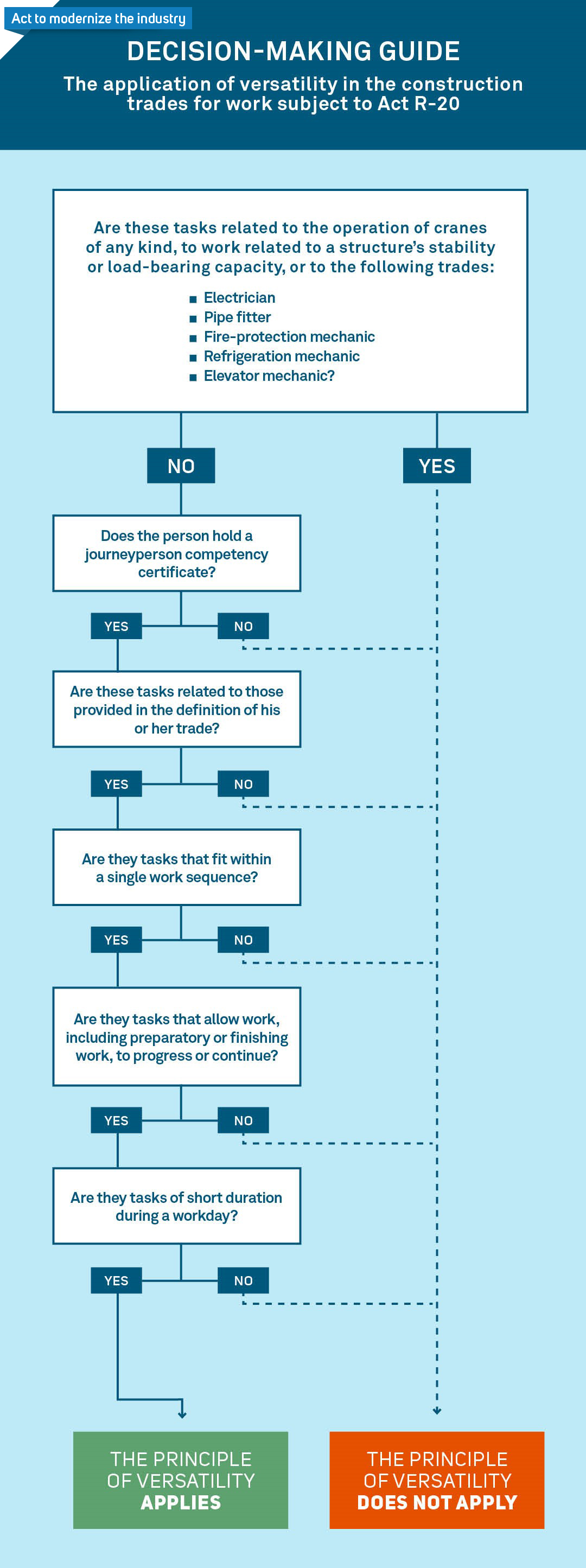 Furthermore, the principle of versatility does not apply to the operation of cranes of any type, to work related to a structure’s stability or load-bearing capacity, or to tasks in the following trades: electrician, pipe fitter, fire-protection mechanic, refrigeration mechanic, and elevator mechanic.